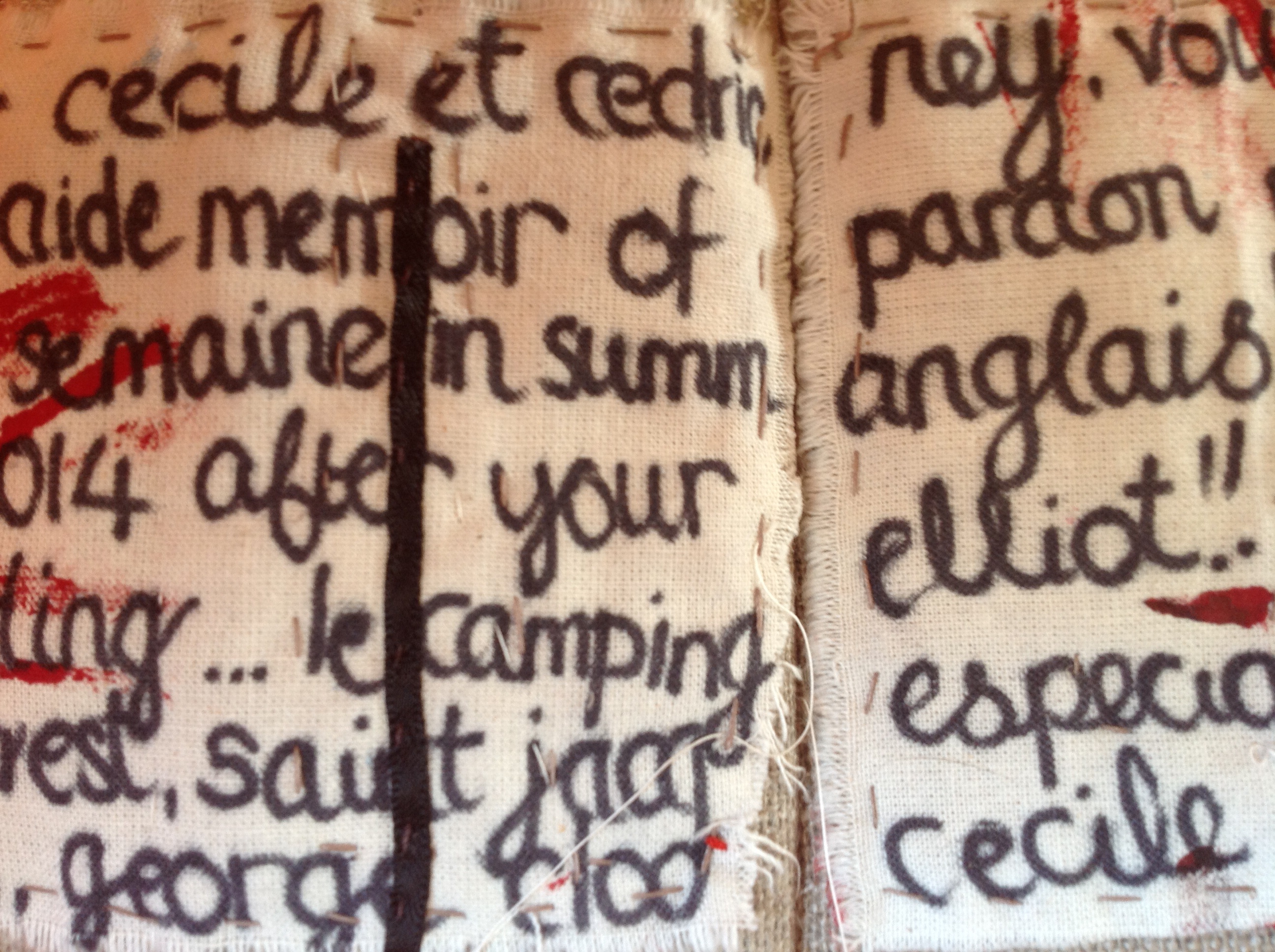 Having an amazing time in Brittany. Stitching loads. Brought a small amount of thread and material to use..all scraps and some threads I have on extended loan from Lynn Onions…oops! Promise I will return…still taking over your desk Lynn! Books have started to appear and have rather a lot. Here is one I made for the most amazing French couple that were staying in the adjacent ‘gite’! Lovely to have different source of inspiration for my work!