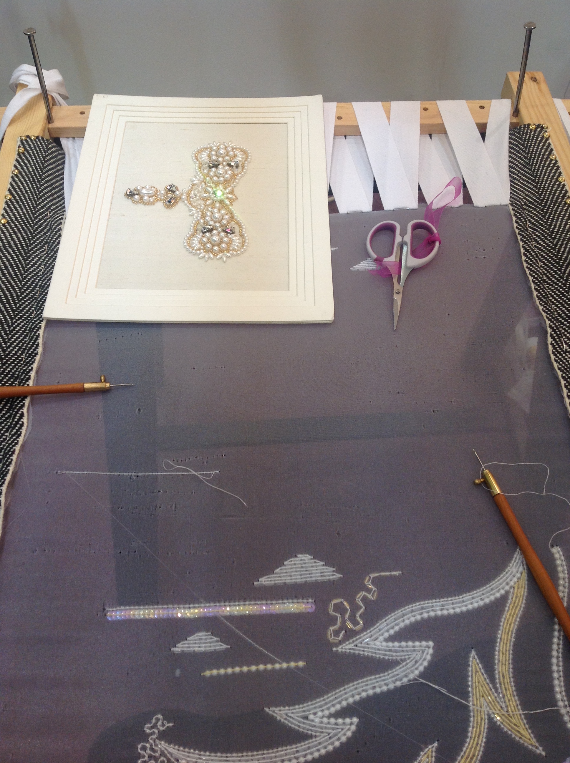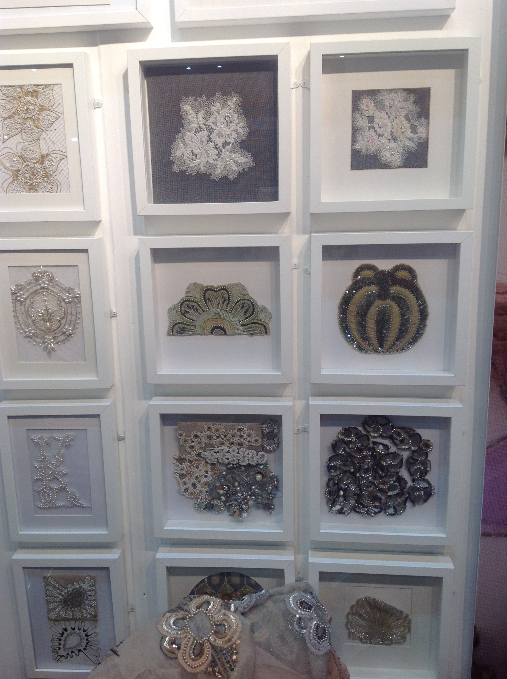 This is Diana Vernon demonstrating the art of tambour. The picture above shows samples of tambour work . She and Lesley Coidan were demonstrating and letting people have a go at this amazing art of couture beading. They are fantastic teachers and do workshops and lectures. See their website for more details. http://www.couturebeading.com