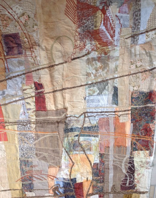 I am exhibiting two pieces…one from thefirst year of my Stitched Textiles Degree…. ‘My past in the present’ which I think has ‘cathedralesque ‘ qualities ……my phrase and I’m sticking with it…..see if you do…..  Spot the angel of the North and the 5 Bridges…yes it dates me cos there’s more bridges now……but still fits in with my not admitting to anything over 39 and a half years old back story….,prizes on a post card if you can guess where I’m from!!!!! My avid follower(s) will of course know this piece and appreciate its’ significance blah blah blah…. that was supposed to sound up myself by the way….. on purpose but my avid follower(s) will already know that won’t they/ you Sarah!!!!! (Talking of which.. ..post cards that is ……decided to take the plunge and have some post cards printed to go with my show at Alexandra palace in October at the Knitting and Stitching Show… I love them but I am biased. Hope I can flog a few as this framing malarkey is not cheap!!!! Debating between 50p and £1….hmmmmm if you read my blog you can have one for 50p!!!!