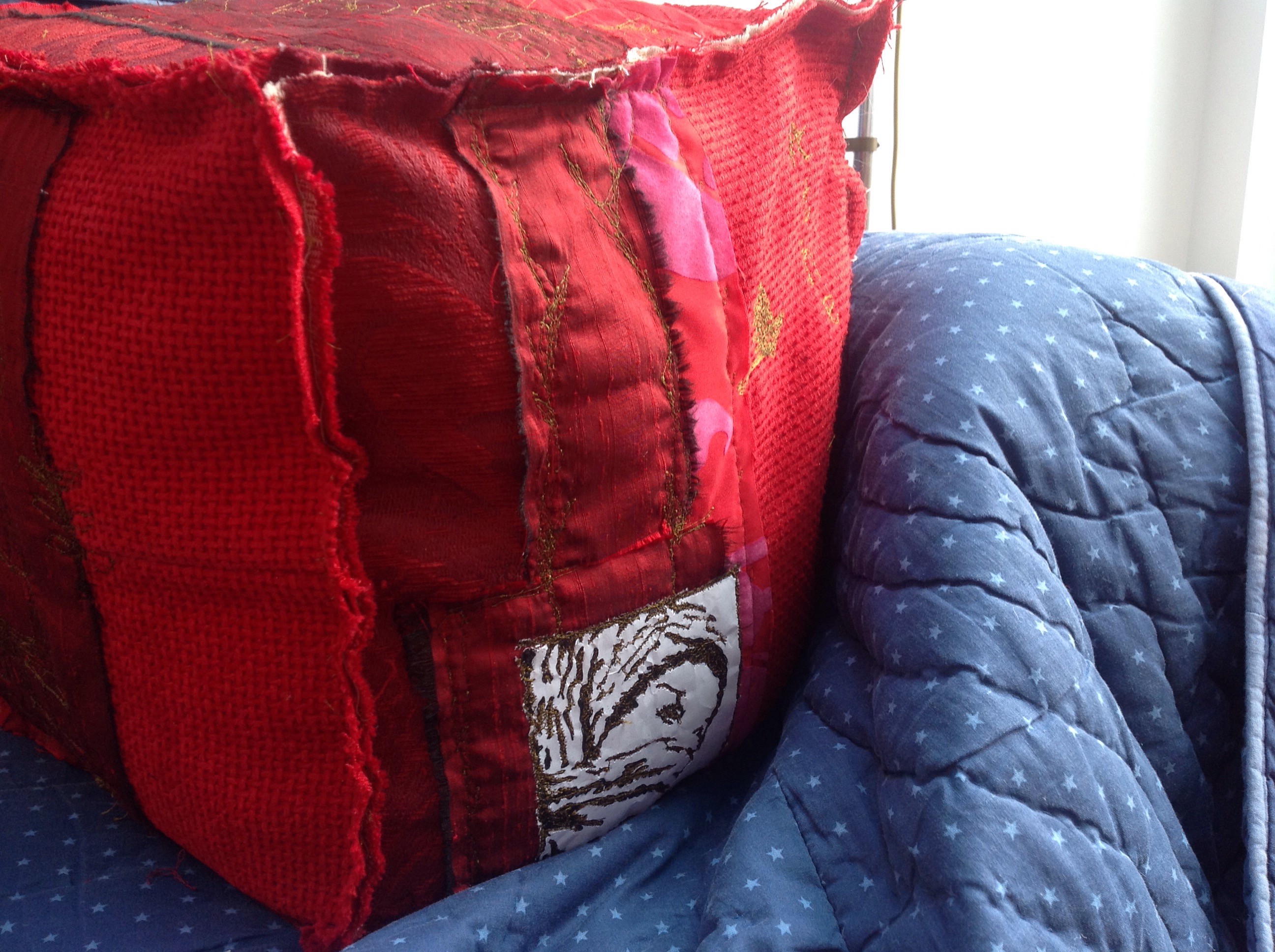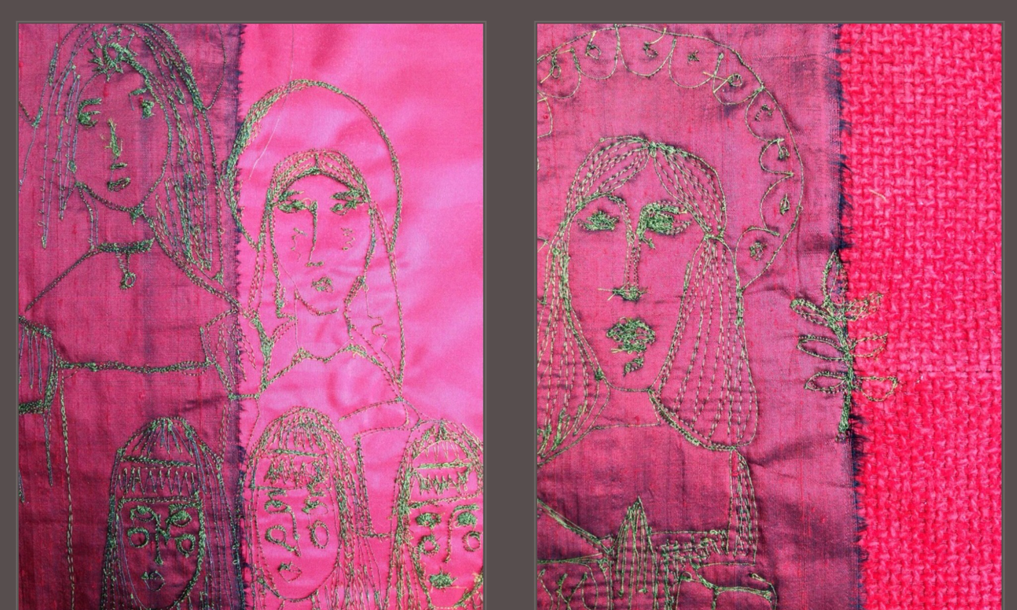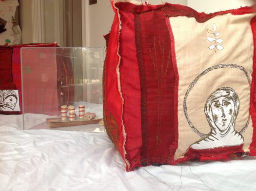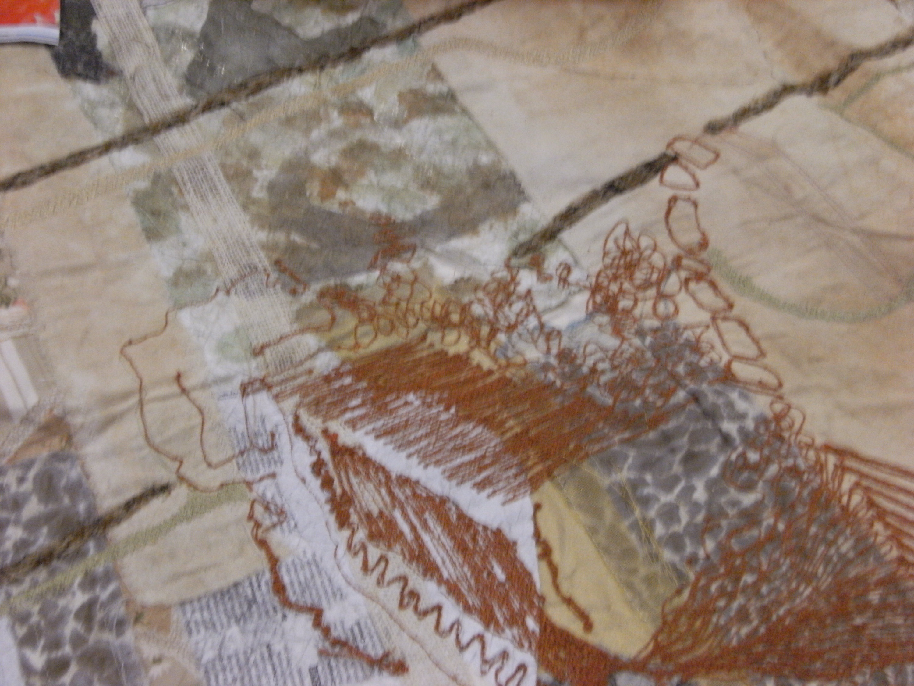 ‘Helen is a Hampshire based artist originally from the North East of England.She combines her passion for drawing and stitch with a compulsion to never throw anything away. Fortunately recycling is integral to her work . As well as an interest in drawing and creating machine embroidered images she is fascinated by stitch in general and the emotion and energy produced when people come together to do so.  Helen is currently about to exhibit at Romsey Abbey and still needs to  finish the sodding work. Her piece is called the abbesses’ new clothes. She is going to be extremely busy over the next few days.  Helen blogs about her non-progress at http://www.helensill.com’